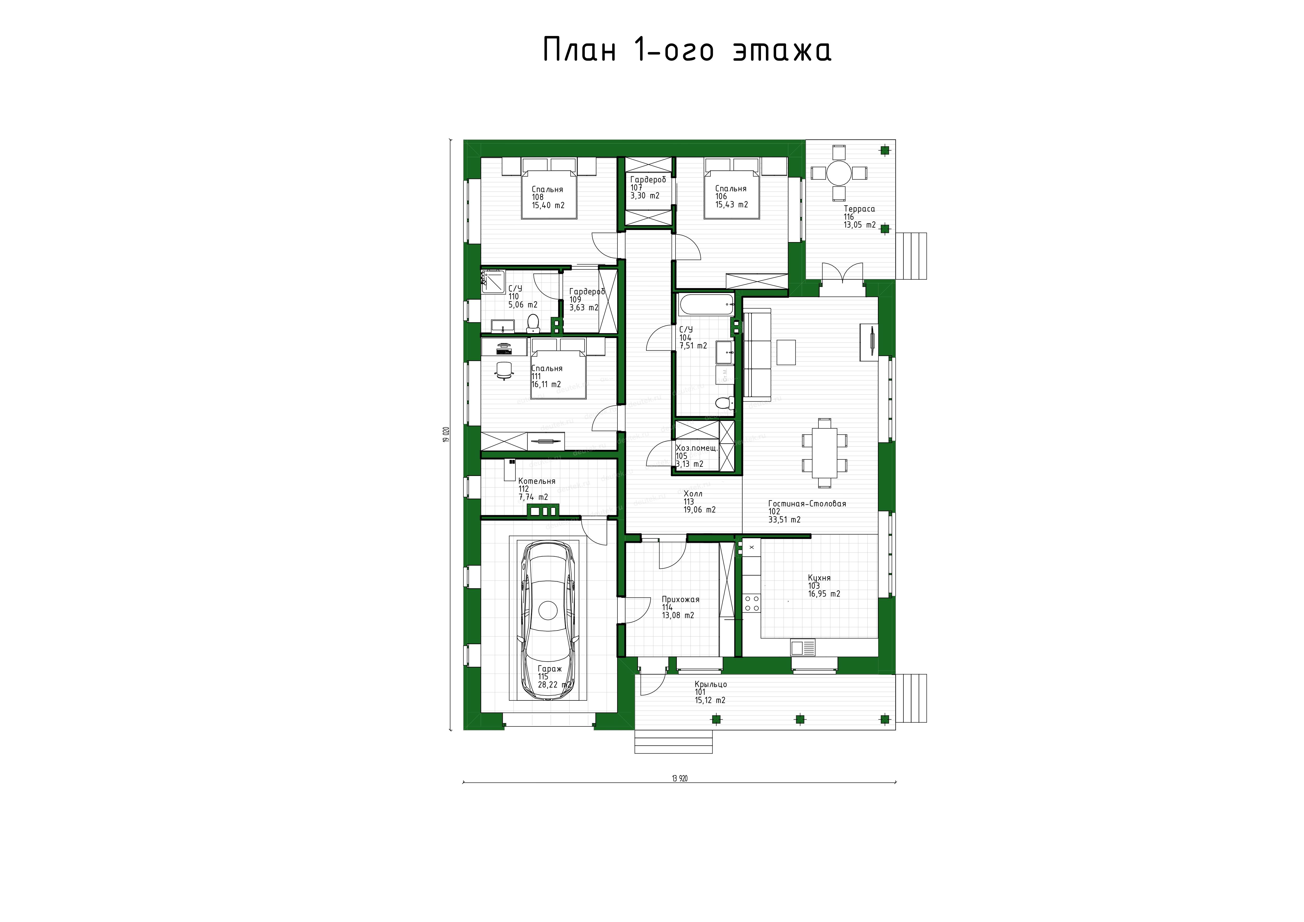 | Фасад: | облицовочный кирпич, цоколь - декоративный камень |