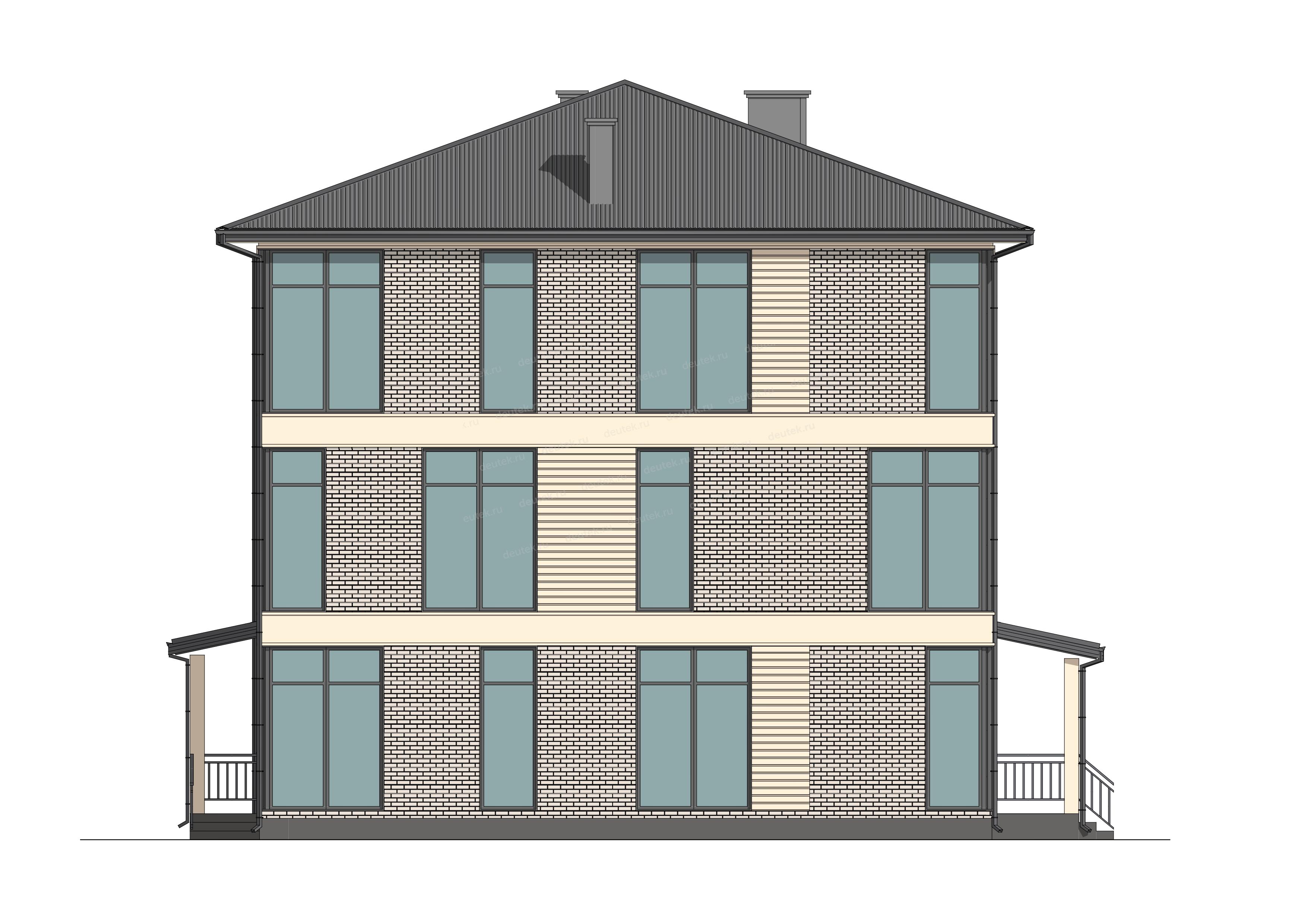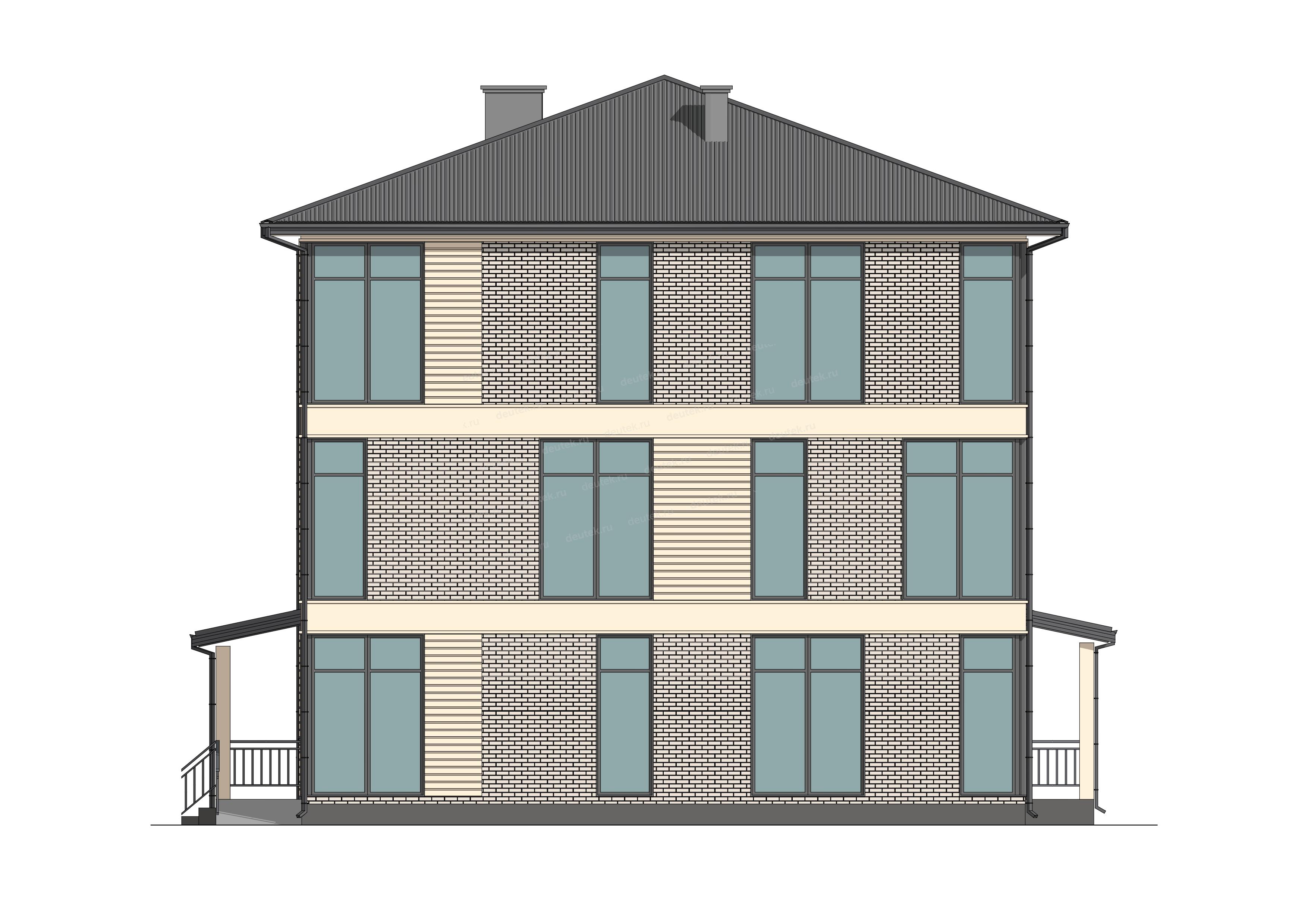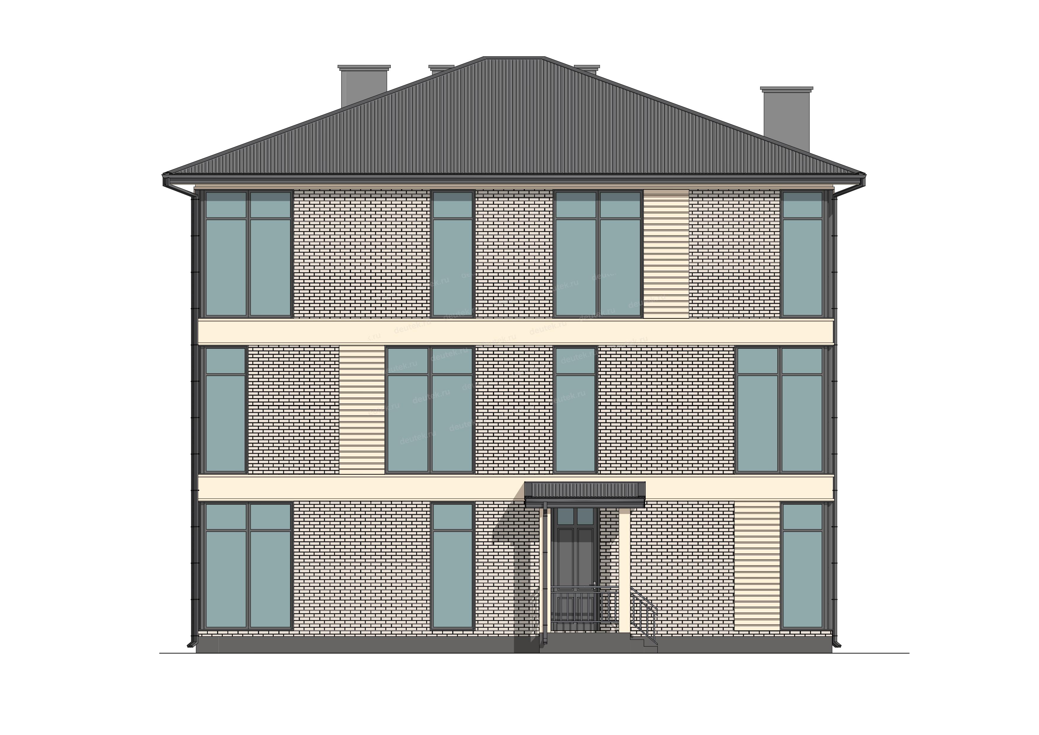 | Фасад: | комбинированная: клинкерная плитка бежевый оттенок, декоративные вставки планкеном. Цоколь: декоративный камень |